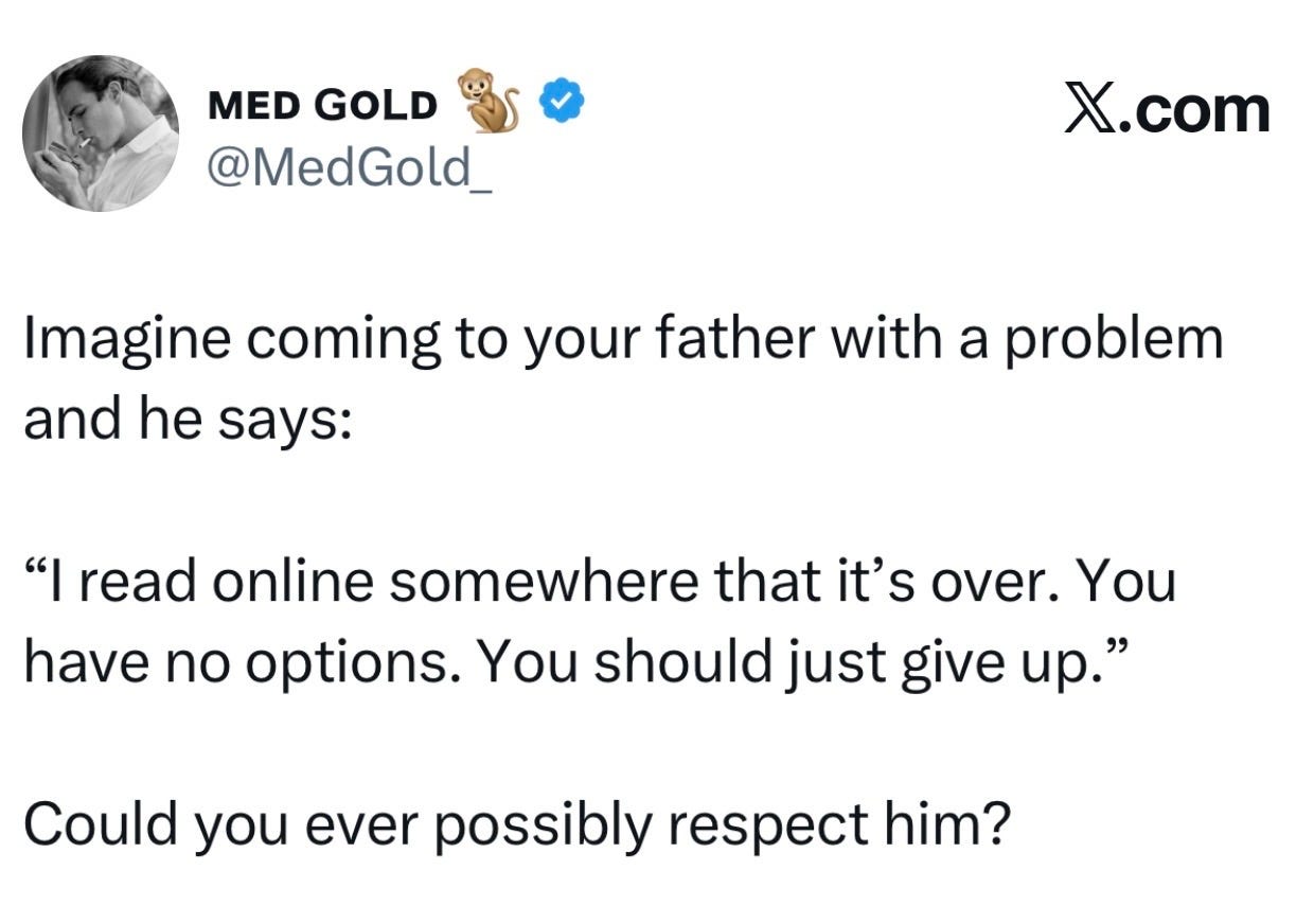 And to be fair, you don’t need to spend a lot of time online to be concerned about the state of civilization. But it’s not impossible to thrive regardless of what blackpillers tell you. Bad news will always come. The question for men isn’t whether the world is good or bad, it’s how you’re going to handle it.