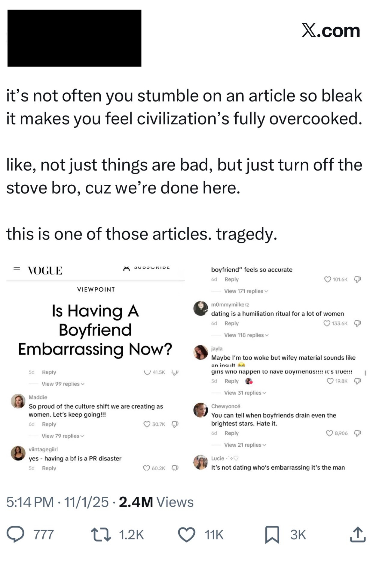 That post is just one example of men spreading demoralization propaganda online. Have you seen Andrew Tate’s account lately? Such is the fate of many washed up men.