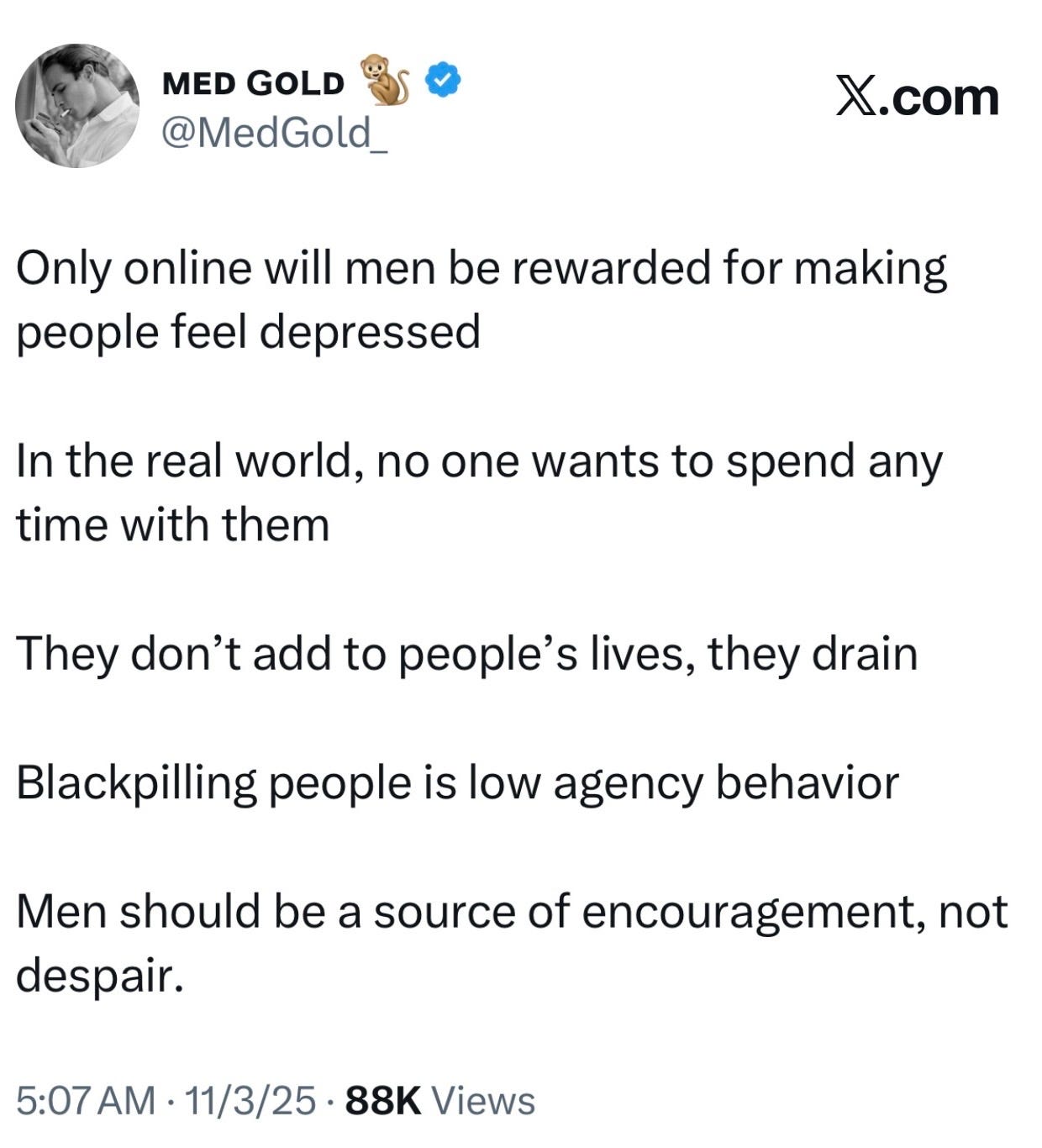 Trying to depress people is fundamentally cowardly and unmanly. I’m sympathetic to men having a rough time, but I have absolutely zero respect for men who try to blackpill people.
