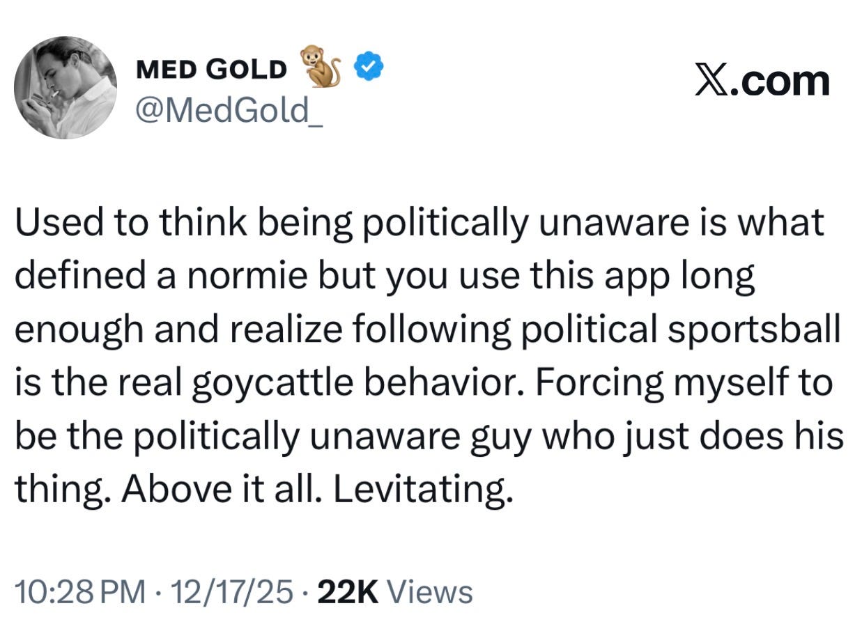 If I need to look over my shoulder while taking a walk in my city, then I have no interest in what Tucker Carlson said about Ben Shapiro. If women are being burned alive on the subway, then I can’t clap if Trump invades Venezuela. If innocent bystanders are being murdered in broad daylight, then I don’t care if Erika Kirk is being controlled by Jewish Aliens. The set of issues we’re expected to discuss are too embarrassing to validate. Bread-and-circus issues have nothing to do with Americans.