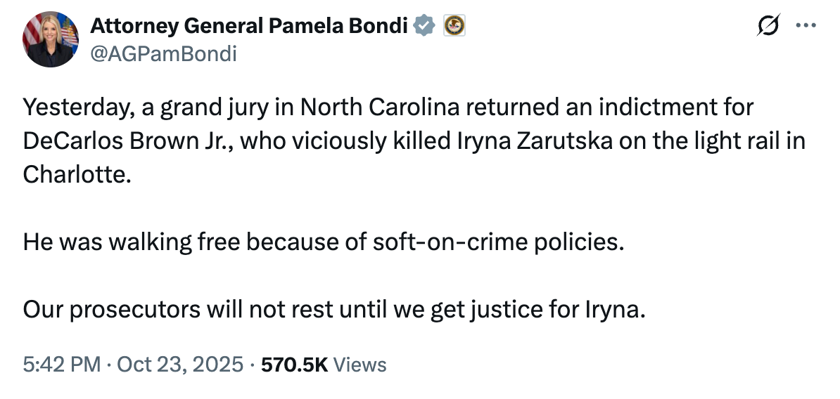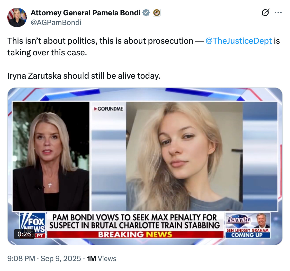 Remember Iryna Zarutska? The girl who got viciously murdered by a feral black man who bragged “I got the white girl” immediately after? Pam Bondi remembers. How do I know? Well, she posted about it!