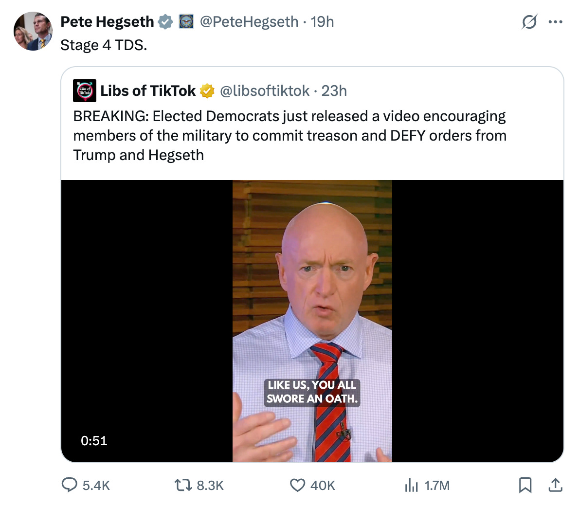 Pete Hegseth is a breath of fresh air. Handsome, young, and booming with vitality. He’s great at yelling Based Slogans (“No more dudes in dresses!”) and blowing up boats — but when Democrats tell his own military to ignore his orders, what does the Secretary of War at the Department of War (Wow, Based™) do about it?