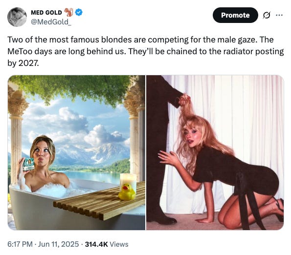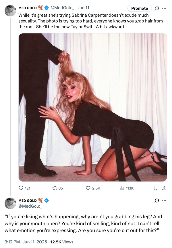 It’s worth noting that Sabrina Carpenter is extremely popular, not far behind from Taylor Swift and Ariana Grande. Espresso was the #1 song in the world last year (banger tbh) with over 1 billion streams on Spotify. She won Grammy Awards for Best Pop Vocal Album and Best Pop Solo Performance. All of the discussion online isn’t just about the picture, it’s about the declining standards of hotness and a huge misread of what red-blooded heterosexual men are attracted to.